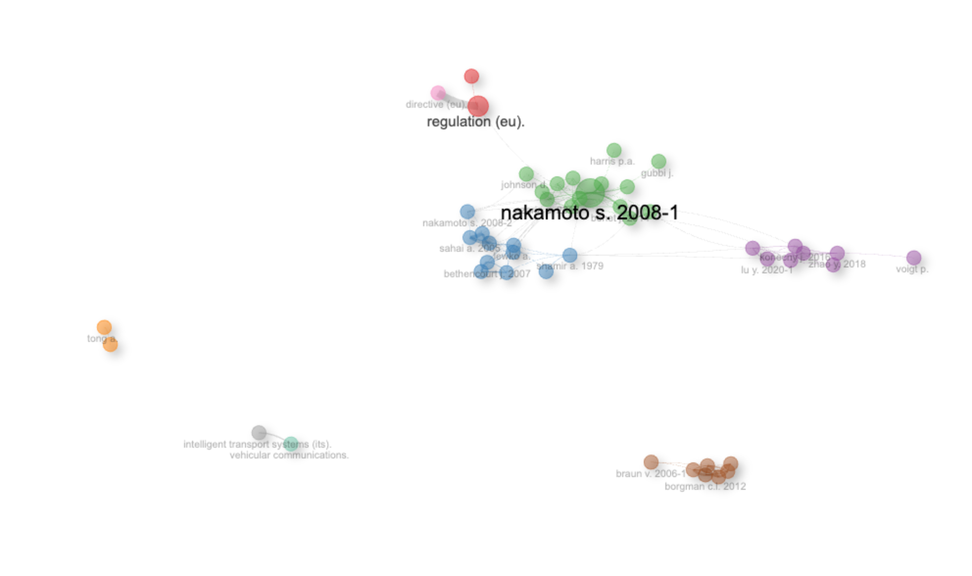 3. Temporal Trends: Given that the network displays publications from a range of years, consider how the prominence of different clusters has changed over time. Has the “purple cluster” risen in prominence more recently? Are other clusters declining in influence? This can tell you about the evolution of the field.