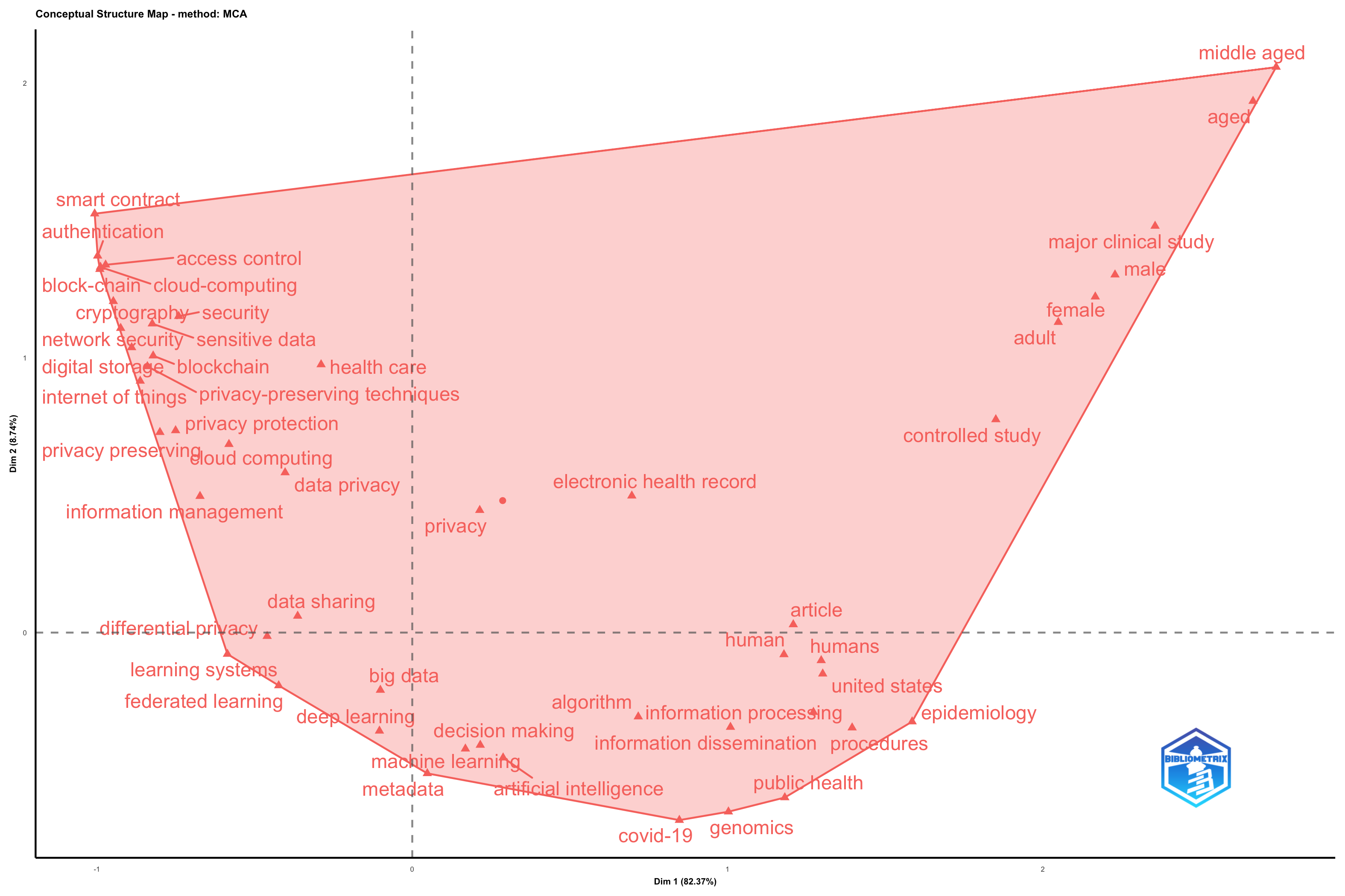 Okay, let’s analyze this factorial map derived from the bibliometric analysis of your SCOPUS dataset. The map is generated using Multiple Correspondence Analysis (MCA) on merged keywords (KW_Merged), with a minimum keyword degree of 221. This means only keywords appearing frequently enough (>=221 times) are included. The analysis uses unigrams (ngrams=1), no stemming (stemming = FALSE), and identifies clusters using a maximum of 8 clusters (k.max = 8), though with `clust=1` parameter, only one cluster will be drawn on the map. The plot shows only the first two dimensions (Dim 1 and Dim 2), which explain 82.37% and 8.74% of the total variance, respectively.