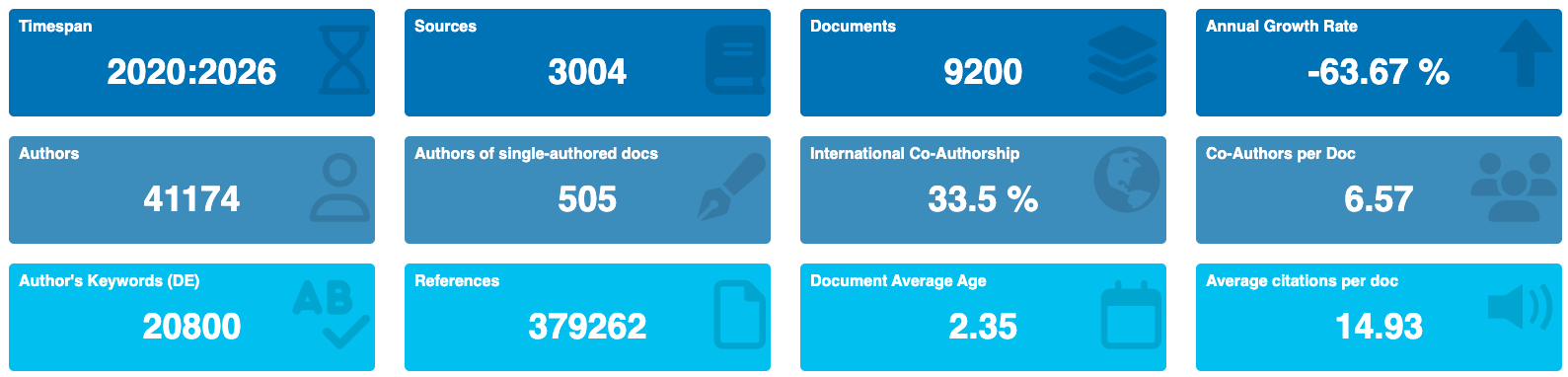 The dataset represents a substantial collection of research publications (9200 documents) indexed by SCOPUS, spanning from 2020 to 2026. This gives us a relatively recent snapshot of research activity. However, the significant negative annual growth rate suggests a sharp decline in the number of publications indexed in this particular collection in the later years. We need to investigate the reasons for this decline (e.g., changes in search query, database coverage, or actual decrease in research output in the specific field). Despite the recent nature of the data, the average document age is 2.35 years.