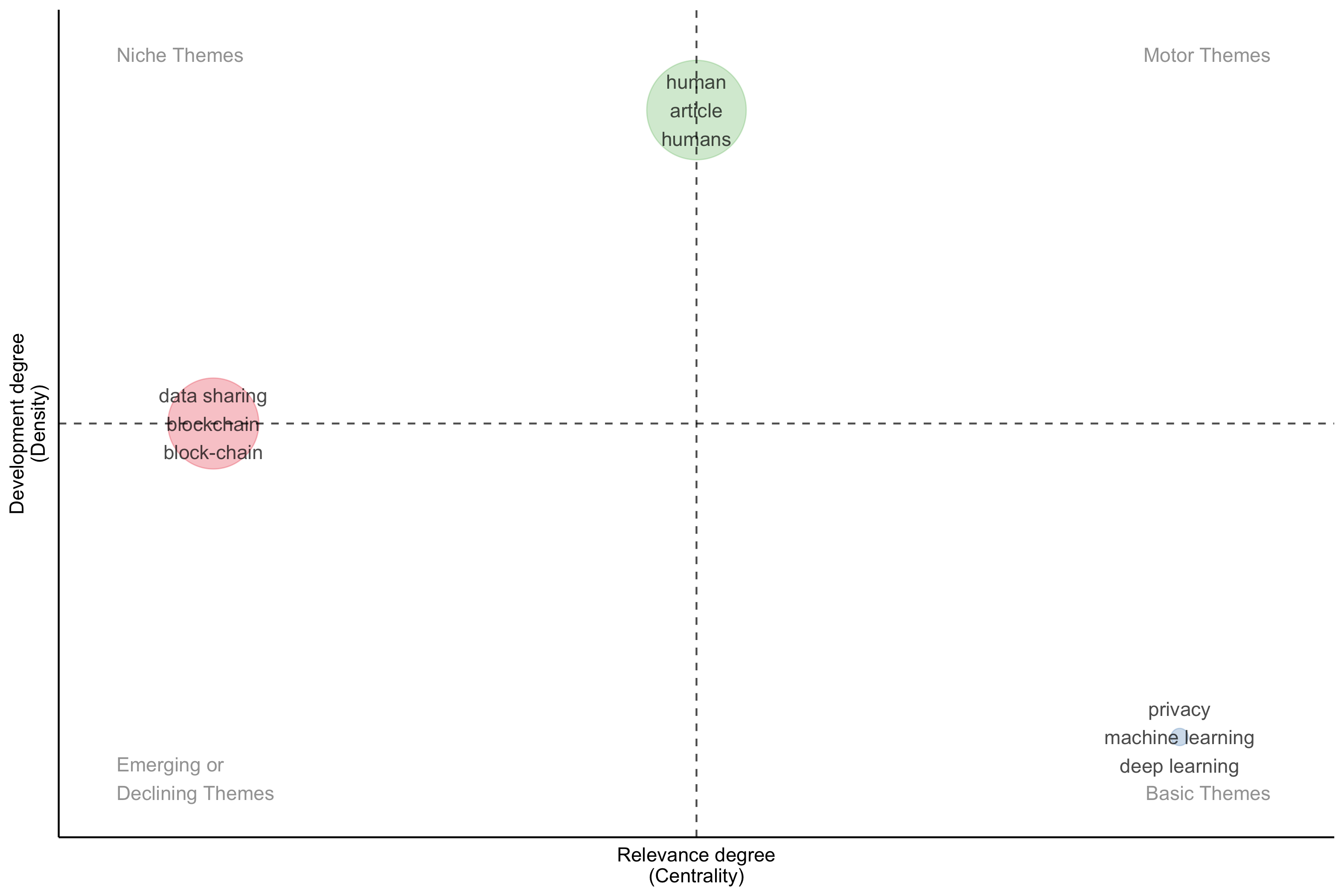 * Interpretation: “Privacy,” along with “machine learning” and “deep learning” is a fundamental theme (high centrality) but less developed in this specific dataset (low density). This suggests that while privacy concerns are recognized as important to the overall research area, it is not as extensively studied within the specific context defined by your keyword search and inclusion criteria.